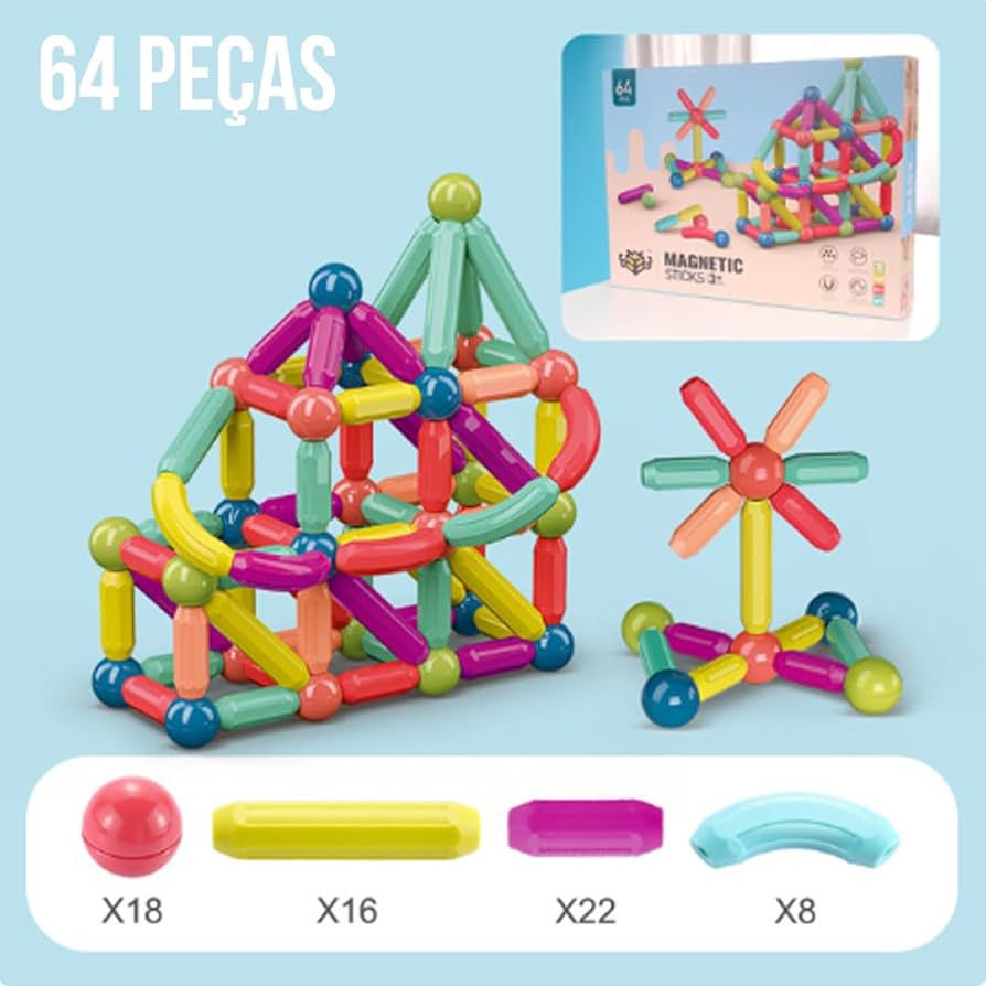O kit magnético de montar com 64 peças permite criar diversas estruturas em 3D, estimulando o aprendizado enquanto a criança brinca. Com hastes coloridas e conexões em formato de bolinhas, as peças se encaixam com facilidade, incentivando a exploração e a criatividade.