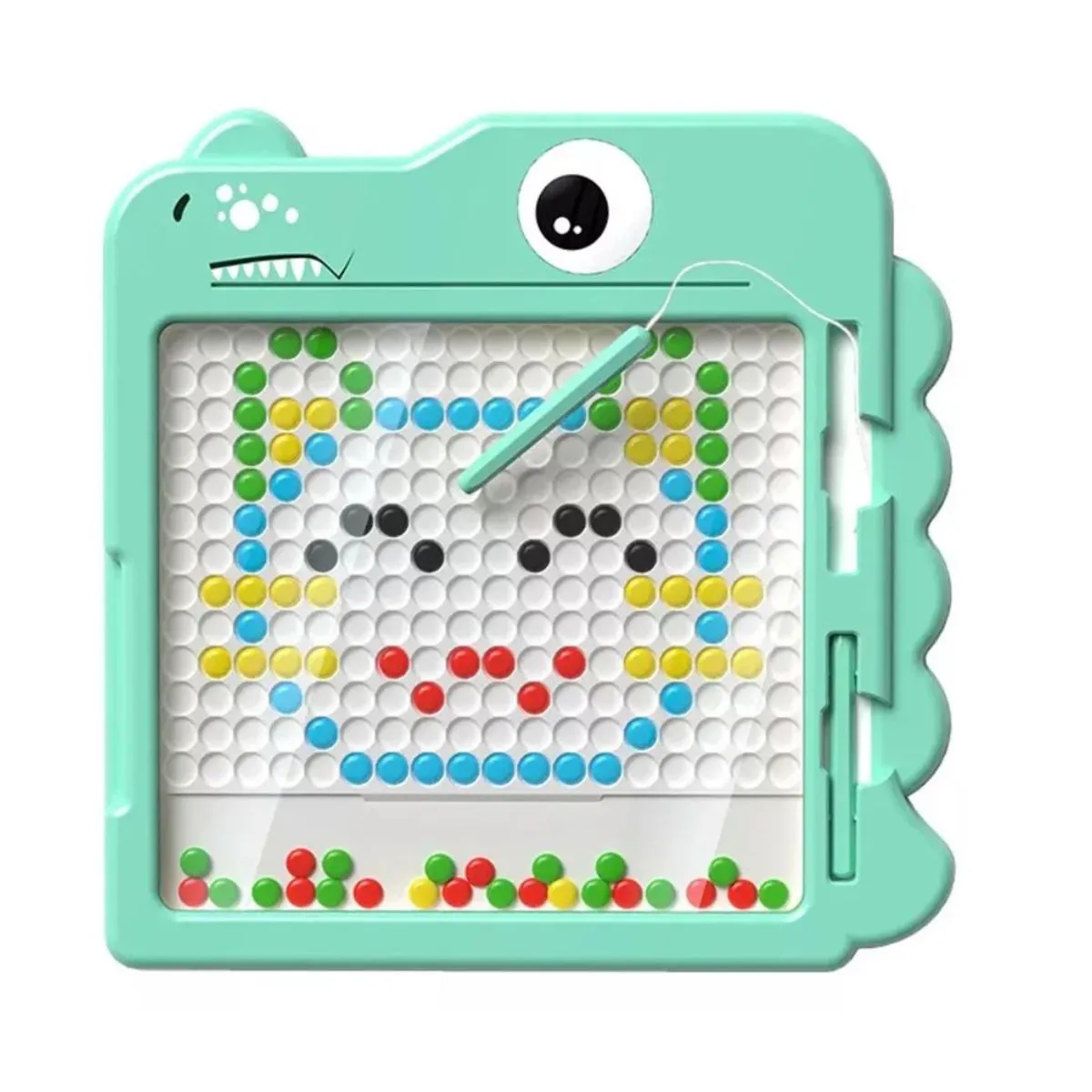 É um quadro com imãs coloridos e 2 canetas magnéticas e o desafio é carregar cada peça imantada com o auxilio da caneta para o local certo formando um desenho, que você pode escolher uma das 20 sugestões que acompannham o produto ou a criança brinca livre de acordo com sua criatividade.