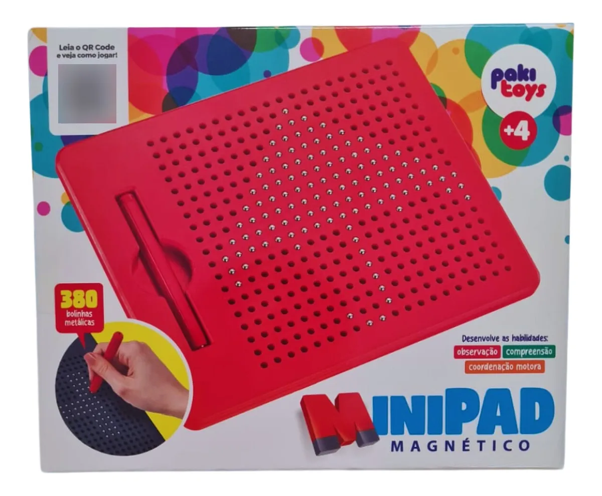 Mini Pad Magnético é uma tela com bolinhas metálicas e uma caneta magnética, que quando se aproxima da tela é possível escrever e desenhar.