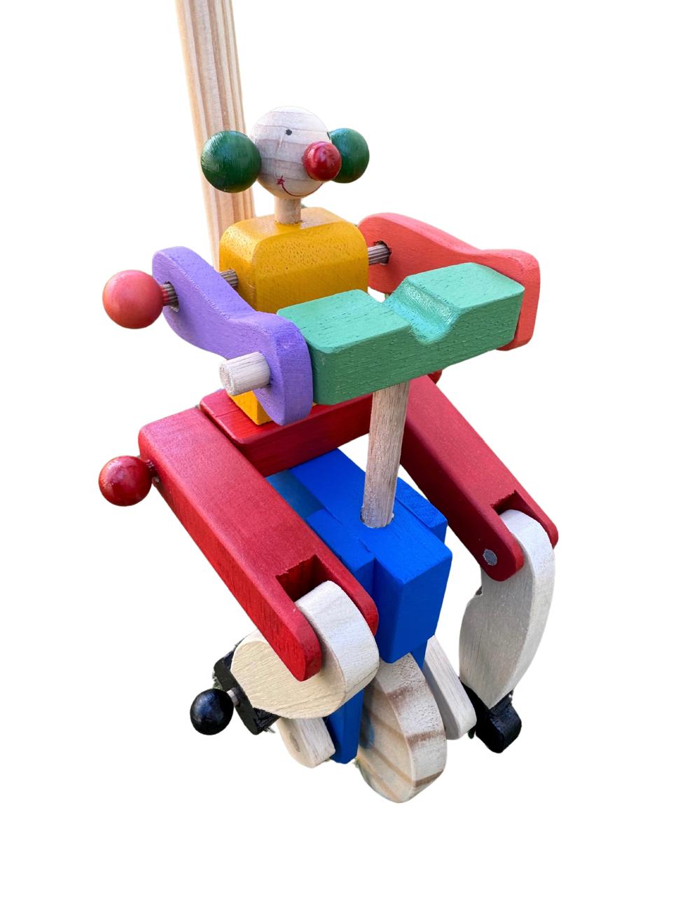 Encante as crianças com o Palhacinho Ciclista, um lindo brinquedo de empurrar feito artesanalmente em madeira.