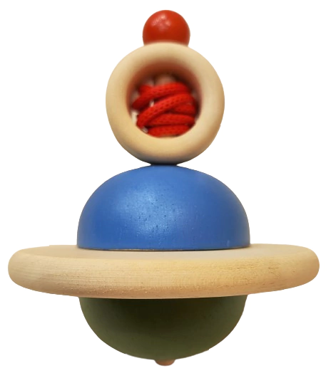 O Pião Francês de madeira é a versão mais fácil para as crianças pequenas brincarem, ao puxar o cordão do lançador, o pião se solta e começa a girar como num passe de mágica.