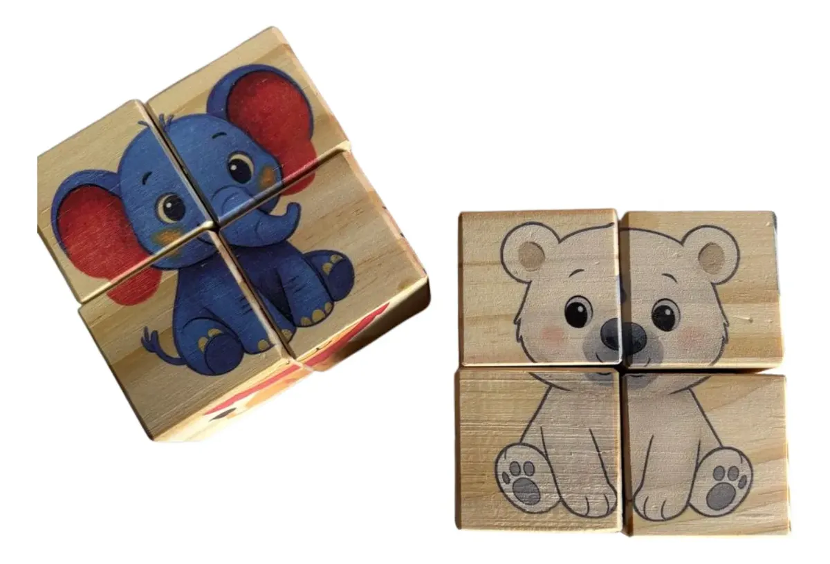 São 12 figuras de animais (conforme fotos, mas só dá para montar 2 por vez) para a criança montar, como se fossem 12 quebra-cabeças tridimensionais em cubos (blocos).
